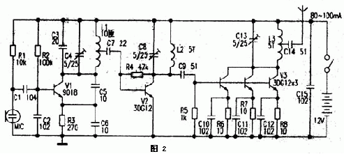 圖2為2km調(diào)頻發(fā)射機(jī)電路。本電路分為振蕩、倍頻、功率放大三級。電路中V1、C2--C6、R2、R3及L1組成電容三點(diǎn)式振蕩器,其振蕩頻率主要由C3、C4和L1的參數(shù)決定,其振蕩頻率為44~54MHz,該信號從L1的中心抽頭處輸出,再經(jīng)過C7耦合至V2放大,由C8和L2選出44~54MHz的二倍頻信號,即88-108MHz,,此信號由C9耦合至V3進(jìn)行功率放大,V3由3只3DGl2三極管并聯(lián)組成,可擴(kuò)大輸出功率。該電路正常工作時(shí),電流約80-100mA。組成V3的三只3DG12可加上適當(dāng)?shù)纳崞?,以防過熱。制作時(shí)L1~L3用0.31mm漆包線在直徑3.5mm圓棒上單層平繞。