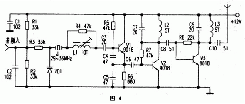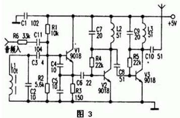 圖4為晶振式發(fā)射機(jī)電路。電路中J.、VD1、L1、C3~C5、V1組成晶體振蕩電路。由于石英晶體J的頻率穩(wěn)定性好,受溫度影響也較小,所以廣泛用于無繩電話及AV調(diào)制器中。Vl是29~36MHz晶體振蕩三極管,發(fā)射極輸出含有豐富的諧波成分,經(jīng)V2放大后,在集電極由C7、L2構(gòu)成諧振于88-108MHz的網(wǎng)絡(luò)選出3倍頻信號(即87~108MHz的信號最強(qiáng)),再經(jīng)V3放大;L3、C9選頻后得到較理想的調(diào)頻頻段信號。頻率調(diào)制的過程是這樣的,音頻電壓的變化引起VD1極間電容的變化;由于VD1與晶體J串聯(lián),晶體的振藩頻率也發(fā)生微小的變化,經(jīng)三倍頻后,頻偏是29-36MHz晶體頻偏的3倍。實(shí)際應(yīng)用時(shí),為獲得合適的調(diào)制度,可選擇調(diào)制頻偏較大的石英晶體或陶瓷振子,也可以采用電路稍復(fù)雜的6-12倍頻電路。若輸入的音頻信號較弱;可加上一級電壓放大電路。