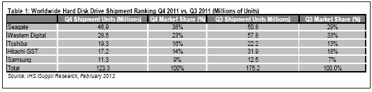 據(jù)IHS iSuppli公司的存儲(chǔ)市場(chǎng)簡報(bào),2011年第四季度希捷重新奪回硬盤(HDD)出貨量的第一排名。此前七個(gè)季度西部數(shù)據(jù)一直保持第一,但去年的泰國洪災(zāi)令其損失慘重。
