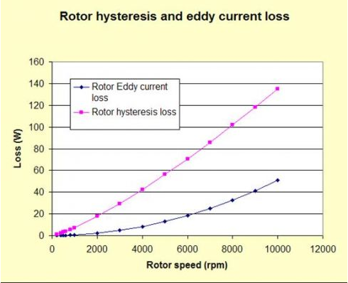 銅損是電機整體損耗中關鍵的部分,MotorSolve先進的損耗計算能力能計算出基于元件級的磁滯和渦流損耗。上圖表明轉子的磁滯和渦流損耗是轉速的函數(或等價的是頻率的函數)。渦流趨勢呈現(xiàn)拋物線型,而磁滯損耗與功率曲線規(guī)律相似。