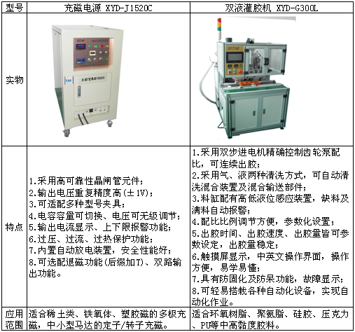 深圳市欣音達(dá)科技有限公司是一家專(zhuān)業(yè)研發(fā)生產(chǎn)流體控制系統(tǒng)及磁性應(yīng)用系統(tǒng)的制造企業(yè),下轄有灌膠機(jī)事業(yè)部、點(diǎn)膠機(jī)事業(yè)部及充退磁機(jī)事業(yè)部,客戶(hù)來(lái)自全球各地。中國(guó)電子展期間,欣音達(dá)科技給我們帶來(lái)了兩款先進(jìn)的產(chǎn)品,其特點(diǎn)如下表所示: