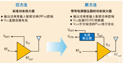 使用DC-DC轉(zhuǎn)換器(功率放大器電源穩(wěn)壓器)的主要目的是減少分母中的Pdc因子。當(dāng)功率放大器與電池直接相連時,Pdc=Vbatt*Ibatt,而當(dāng)它使用功率放大器電源穩(wěn)壓器供電時,Pdc=V o*I o?,F(xiàn)在我們能夠看出,為了增加PAE,V o和Io 必須低于Vbatt和Ibatt。這可以通過降低發(fā)射的射頻功率電平,降低功率放大器電源穩(wěn)壓器的輸出電壓來實(shí)現(xiàn)。這樣也降低了Io (功率放大器的吸收電流),并且由于DC-DC轉(zhuǎn)換器的高效性,電池的輸出電流也會降低?! ?br />