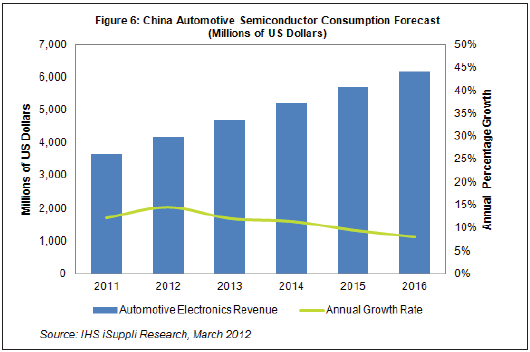 在幾個關(guān)鍵因素的推動下,中國汽車半導(dǎo)體消費2016年以前的復(fù)合年度增長率將達11%。
