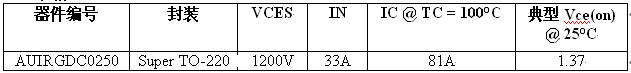 1200V AUIRGDC0250 采用緊湊的 Super TO-220 封裝,低 VCE(on) 可讓該器件降低功耗并實(shí)現(xiàn)更高的功率密度,正 VCE(on) 溫度系數(shù)則使其更適合并聯(lián)。此外,AUIRGDC0250 還提供經(jīng)過(guò)優(yōu)化的方形反向偏壓安全操作區(qū) (RBSOA)。AUIRGDC0250 的軟開(kāi)關(guān)特性使其成為幫助客戶符合系統(tǒng)級(jí) EMI 規(guī)范的理想選擇。