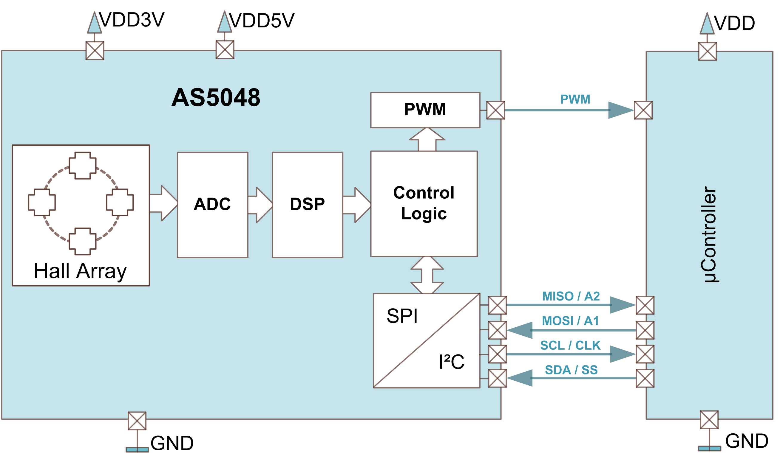 與奧地利微電子現(xiàn)有的磁性編碼器一樣,由于采用了獨(dú)特的集成霍爾傳感器和信號(hào)處理電路,這款器件能有效地排除離散磁場(chǎng)的干擾。這使得AS5048非常適合應(yīng)用在電力和磁性噪聲較大的工業(yè)和醫(yī)療環(huán)境中。
