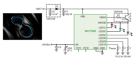 安森美半導(dǎo)體的NCV7430 LIN RGB LED驅(qū)動(dòng)器結(jié)合了LIN收發(fā)器與RGB LED驅(qū)動(dòng)器和內(nèi)存。它是一個(gè)單芯片RGB驅(qū)動(dòng)器,旨在監(jiān)測(cè)汽車內(nèi)部照明中的專用多色LED應(yīng)用。它包含LED顏色和亮度參數(shù)編程的LIN接口(從設(shè)備)。器件通過LIN總線接收指令,隨后獨(dú)立驅(qū)動(dòng)LED。