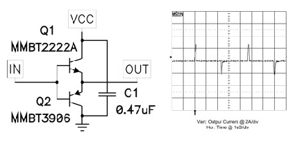 如圖2 hfe曲線所示,通常廠商都不會為這些低電流器件提供高于0.5A的電流。但是,該電路可提供大大高于0.5A的電流驅(qū)動,如圖1中的波形所示。就該波形而言,緩沖器由一個50Ω源驅(qū)動,負載為一個與1Ω電阻串聯(lián)的0.01 uF電容。該線跡顯示了1Ω電阻兩端的電壓,因此每段接線柱上的電流為2A.該數(shù)字還顯示MMBT2222A可以提供大約3A的電流,MMBT3906吸收2A的電流。
