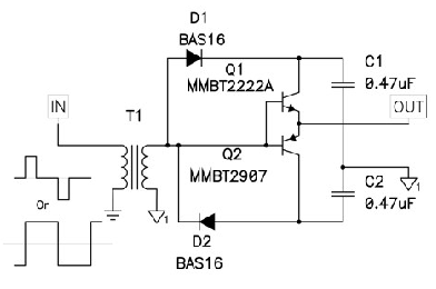圖1中的示意圖顯示了一個NPN/PNP發(fā)射跟隨器對,其可用于緩沖控制IC的輸出。這可能會增加控制器的驅(qū)動能力并將驅(qū)動損耗轉(zhuǎn)移至外部組件。許多人都認為該特殊電路無法提供足夠的驅(qū)動電流。