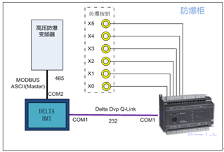該系統(tǒng)主要配置包括ES2R控制器 1 臺,B05S100觸摸屏1臺,高壓防爆變頻器1臺,6枚按鈕防爆。整個系統(tǒng)中,除6枚防爆按鈕安裝在防爆柜面板外,其余部分都封閉于防爆柜體內,變頻器所有操作通過6枚按鈕完成。因為處于防爆環(huán)境中,不能直接操作接觸摸屏,所以要通過PLC的6個輸入點外接防爆按鈕來代替在觸摸屏上的操作。該方案的靈活之處就是避免了操作人員直接觸摸屏,從而防止事故發(fā)生。