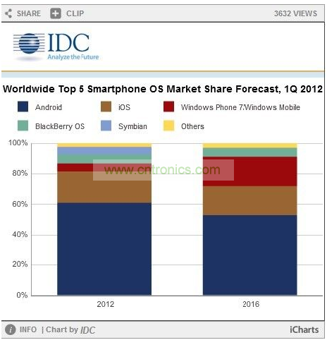 下表反映了IDC對2012年和2016年全球智能手機操作系統(tǒng)所占市場份額以及2012到2016年之間復合年增長率的預期: