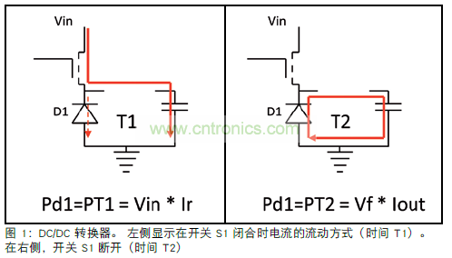 在 T1 期間,D1 處于關(guān)斷狀態(tài);唯一流過(guò)的電流是反向電流 (Ir)。 此電流相對(duì)較低,而且主要由輸入電壓(Vin) 決定。 二極管 (PT1)的功率損耗粗略可用下式計(jì)算:Ir*Vin。