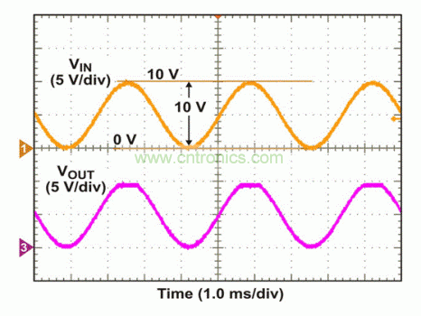為了測試該電路,我們將VCC/2 = 5V DC偏移的300 Hz正弦波應(yīng)用于輸入端。在VOUT出現(xiàn)變化以前,一直對AC幅值進行調(diào)節(jié)。如圖4所示,當(dāng)應(yīng)用10 Vp-p輸入時,VOUT在正軌附近出現(xiàn)一個經(jīng)削波的信號,而非負軌附近。如果輸入超出VCC – 0.8V(本例中為9.2V),這種正軌附近出現(xiàn)的非理想行為是我們能夠預(yù)計到的。9.2V以下VIN電平和低至0V時,VOUT顯示出正確的波形,正如我們所預(yù)期的那樣。