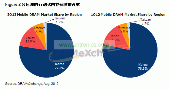 第二季行動式內(nèi)存營收,三星半導(dǎo)體市占逼近全球60%,仍穩(wěn)居龍頭之位,韓系廠商占全球行動式內(nèi)存營收的77.5%,較第一季僅小幅減少1.1%。第三名的日商爾必達市占則是小幅下滑0.8%來到13.9%,美商美光科技則受惠于中低階智能型手機的成長,市占小幅成長至6.7%,位居第四。臺系DRAM廠亦在行動內(nèi)存市場中試圖搶占一席之地,除了華邦電子之外,南科亦在本季營收當中初次嶄露頭角,目前比重雖然不高,但也為整個行動式內(nèi)存的市場帶來不同的氛圍。值得注意的是由于下半年受到景氣不確定因素的影響,各家內(nèi)存制造商在下半年生產(chǎn)與開發(fā)的計劃也逐漸轉(zhuǎn)趨于保守,謹慎應(yīng)對自2009年以來最嚴峻的景氣寒冬。