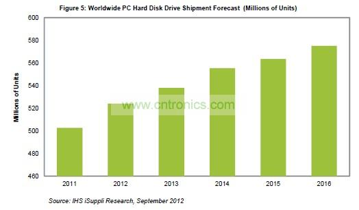預(yù)計(jì)2012年總體PC市場(chǎng)的硬盤出貨量將達(dá)到5.24億個(gè),比去年的5.025億個(gè)增長(zhǎng)4.3%。2012年出貨量將創(chuàng)下硬盤產(chǎn)業(yè)的最高紀(jì)錄,但好景不長(zhǎng)。實(shí)際上,預(yù)計(jì)硬盤出貨量將持續(xù)爬升,每年出貨量都將更上層樓,至少直到2016年。預(yù)計(jì)2016年出貨量將達(dá)到5.751億個(gè),如圖所示。