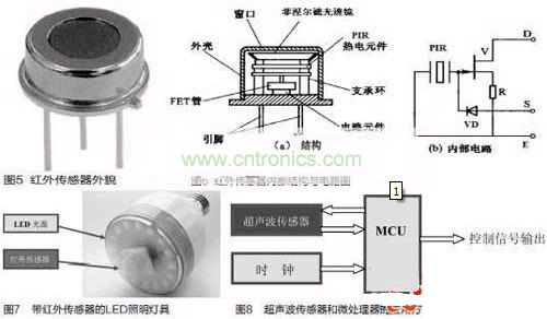 被動式紅外傳感器有三個關(guān)鍵性的元件:菲涅爾濾光透鏡,熱釋電紅外傳感器和匹配低噪放大器。菲涅爾透鏡有兩個作用:一是聚焦作用,即將熱釋紅外信號折射在PIR上:二是將探測區(qū)內(nèi)分為若干個明區(qū)和暗區(qū),使進(jìn)入探測區(qū)的移動物體/人能以溫度變化的形式在PIR上產(chǎn)生變化的熱釋紅外信號。一般還會匹配低噪放大器,當(dāng)探測器上的環(huán)境溫度上升,尤其是接近人體正常體溫(37℃)時,傳感器的靈敏度下降,經(jīng)由它對增益進(jìn)行補(bǔ)償,增加其靈敏度。輸出信號可用來驅(qū)動電子開關(guān),實現(xiàn)LED照明電路的開關(guān)控制。圖5是紅外傳感器外貌,圖6是紅外傳感器內(nèi)部結(jié)構(gòu)與內(nèi)部電路圖。圖7是帶紅外傳感器的LED照明燈具,這是一款E27標(biāo)準(zhǔn)螺口燈頭的燈具,其電源適用范圍是AC180V-250V(50/60Hz),紅外傳感器檢測范圍大約在3m~15m,其標(biāo)準(zhǔn)產(chǎn)品IFS-Bulb3W燈具達(dá)80lm,5W燈具達(dá)140lm.在LED光源模塊的中央部分嵌入紅外線傳感器。一旦紅外傳感器檢測到人的體溫,LED電燈泡將會在50s內(nèi)自動開啟與關(guān)閉。適用于任何一種室內(nèi)應(yīng)用,如走廊、儲藏室、樓梯和大廳入口處。