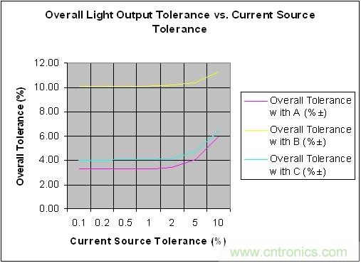 表2和圖3給出了整體容差和一列假設(shè)電流源容差的對比情況,此時(shí)假設(shè)LED光輸出在350mA的區(qū)域內(nèi)隨前向電流呈線性變化。