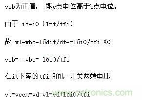 因此,在關(guān)斷過程一開始,vt立即從零上升到vcem,it在從i0下降至零期間,vt=vcem不變。直到it=0、id=i0以后,vt才下降為電源電壓vd,如圖5(b)所示。vcem超過vd的數(shù)值取決于lб、tfi和負(fù)載電流i0,顯然過快的電流下降率di/dt(即tfi?。⑦^大的雜散電感l(wèi)б或負(fù)載電流過大都會(huì)引起關(guān)斷時(shí)元件嚴(yán)重過電壓,且伴隨著很大的功耗。