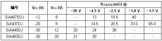 開關(guān),以及智能手機(jī)、平板電腦、移動(dòng)計(jì)算設(shè)備、硬盤驅(qū)動(dòng)器和固態(tài)驅(qū)動(dòng)的同步降壓轉(zhuǎn)換應(yīng)用里的控制開關(guān),-12 V SiA467EDJ提供了13m?(-4.5V)的極低導(dǎo)通電阻。-20V SiA437DJ的導(dǎo)通電阻為14.5m?(-4.5V),-30V SiA449DJ和SiA483DJ的導(dǎo)通電阻分別只有20m?(-10V)和21m?(-10V)。另外,SiA437DJ和SiA467EDJ的電流等級高達(dá)30A,承受很大的涌入電流,可用于負(fù)載開關(guān)。