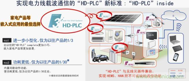 “HD-PLC”inside是最適合利用已有電力線的、作為高速電力線載波通信方式之一而備受矚目的“HD-PLC”的嵌入的標準,該標準通過嵌入白色家電、HEMS、BEMS以及HAN相關(guān)設(shè)備等,可將電力線作為通信網(wǎng)絡(luò)使用。新標準產(chǎn)品搭載了間歇動作功能,與以往的PLC產(chǎn)品相比,可進一步大幅降低功耗。