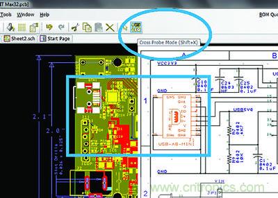 6.0版本中的交叉探測(cè)(X-probe)功能能夠在軟件內(nèi)實(shí)現(xiàn)原理圖與PCB設(shè)計(jì)視圖之間的即時(shí)引用,從而進(jìn)一步加快設(shè)計(jì)過程。通常情況下在PCB視圖中元件的識(shí)別是比較直觀、容易的,但在原理圖中找到該元件的對(duì)應(yīng)符號(hào)卻不那么容易,除非用戶對(duì)整個(gè)系統(tǒng)都了如指掌。通過交叉探測(cè)功能,用戶只需在任一視圖中點(diǎn)擊某個(gè)元件,即可迅速跳轉(zhuǎn)到對(duì)應(yīng)視圖中的同一元件。該功能可從PCB視圖跳轉(zhuǎn)到原理圖,反之亦然。