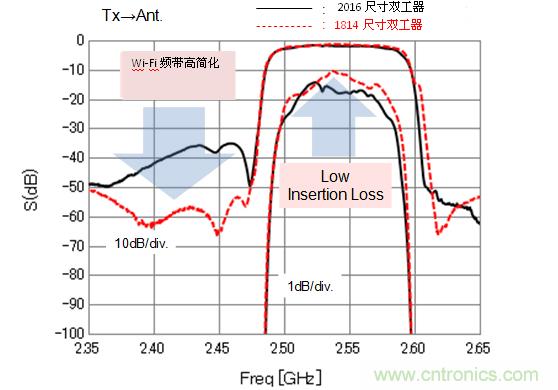 圖5所示為Band7用的2016尺寸和1814尺寸的雙工器的傳輸端特性比較。為了跟Wi-Fi系統(tǒng)共存,必須在Wi-Fi頻帶中進(jìn)行高減衰的Band7雙工器2016尺寸的基礎(chǔ)上進(jìn)行了改善。傳輸端的傳送特性是在Wi-Fi頻帶中進(jìn)行高減衰、實(shí)現(xiàn)了Band7傳輸頻帶的低插入損耗的目標(biāo)。雖然受到了1814尺寸小型化設(shè)計(jì)自由度的限制,我們還是注重了電極設(shè)計(jì)的舒適化、同時(shí)在芯片布局上花了足夠的心思,所以Band7的特性超越了2016尺寸。