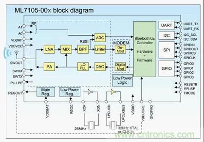 圖1:Bluetooth® LE LSI(ML7105-00x)的內(nèi)部結構