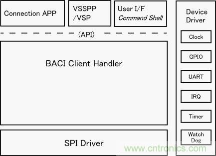 BACI通過簡化與主機之間的通信來降低訪問頻率。而且,在結構設計上采用通過事件使主機啟動的結構,因此,是盡可能使主機停動來抑制耗電量的設計。綜上所述,本LSI在整個結構模塊上進行了降低耗電量的設計,從而,使紐扣電池驅(qū)動3年以上連續(xù)工作成為可能。主機和堆棧結構如圖2所示。