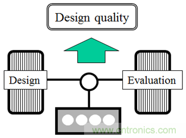 西森久雄在總結(jié)時表示:“通過提供來自T3Ster測量結(jié)果的結(jié)構(gòu)函數(shù),與設(shè)計值的比較和驗證可以更詳細的進行。在可靠性測試中使用這個測量方法已經(jīng)幫助我們發(fā)現(xiàn)影響壽命的設(shè)計缺陷,而且由于設(shè)計值現(xiàn)在能夠測量出來,因此進行前端裝載成為可能。此外,我們還可以通過降低設(shè)計中的重復工作以降低原型成本。”(圖 3)西森久雄通過一個汽車隱喻很好地表達了他對設(shè)計和評估過程的觀點:“評估和設(shè)計就像質(zhì)量保證的兩個‘輪子’,重要的‘發(fā)動機’則為輪子提供驅(qū)動力。通過適當?shù)亟M合 CAD、CAE 和自動化測量,輪子將把‘優(yōu)質(zhì)的設(shè)計’帶到路上。”(圖4)