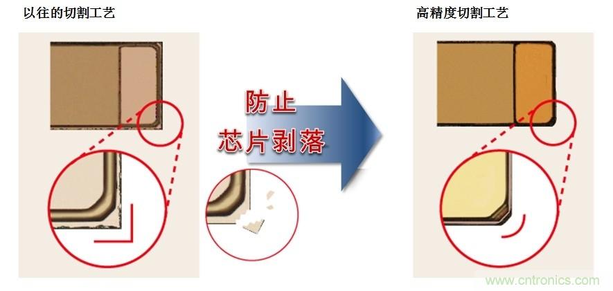 ROHM通過采用與以往不同的、獨(dú)創(chuàng)的微細(xì)化技術(shù),在開發(fā)制造系統(tǒng)的同時(shí),改進(jìn)切割方法,在切割工藝上將封裝尺寸公差大幅降至±10μm。通過提高尺寸精度,消除毛刺和碎片,有助于減少貼裝時(shí)的吸著誤差以及提高貼裝精度。