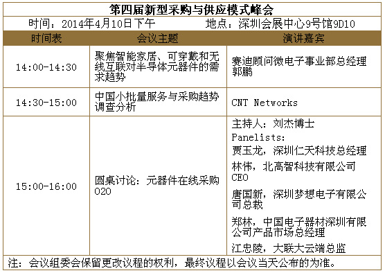 此次峰會旨在幫助供需雙方的經(jīng)理人了解熱點(diǎn)市場帶來的對半導(dǎo)體元器件的需求變化,中國小批量供應(yīng)服務(wù)與采購趨勢。圓桌討論將針對采購和供應(yīng)中的熱點(diǎn)話題,中國電子分銷商聯(lián)盟秘書長劉杰博士與行業(yè)領(lǐng)先的國內(nèi)和國際分銷商總裁和總監(jiān)們逐一分享思路,歡迎參與互動。參會可以通過網(wǎng)上或微信(關(guān)注我愛方案網(wǎng)),報(bào)名注冊: