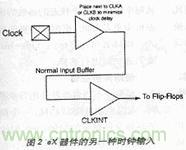 有時(shí)用戶很難阻止時(shí)鐘進(jìn)入器件。在此場(chǎng)合,用戶可使用與CLKA或CLKA相鄰的正常輸入引腳并在設(shè)計(jì)中加進(jìn)CLKINT。這樣,時(shí)鐘將通過(guò)靠近時(shí)鐘引腳的正常輸入進(jìn)入器件,再通過(guò)CLKINT向器件提供時(shí)鐘資源。