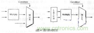 這 是一種在塊輸出不用時(shí)防止輸入信號(hào)使塊開關(guān)工作的技巧。例如考慮一個(gè)乘法器,它的輸出僅在某些特定條件下才使用。在此場(chǎng)合可增添一個(gè)鎖存器,這樣每當(dāng)輸出 不用時(shí),乘法器的輸入將阻止不必要的開關(guān)動(dòng)作帶入乘法器(圖4)。一個(gè)鎖存器只需一個(gè)組合單元,并不占用過(guò)多芯片面積。
