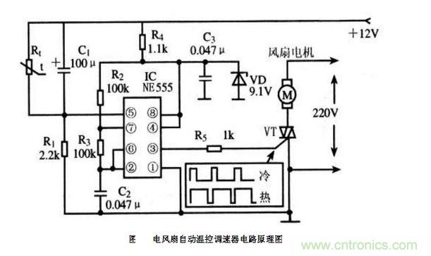 電路工作原理:圖中IC是555時(shí)基電路,與R2、R3和C2等元件構(gòu)成多諧振蕩器,可發(fā)出占空比可調(diào)的矩形波信號。當(dāng)溫度變化時(shí),熱敏電阻的阻值發(fā)生變化,改變多諧振蕩器輸出方波的占空比,調(diào)節(jié)雙向晶閘管VT的導(dǎo)通角,從而改變風(fēng)扇電極兩端的電壓,自動(dòng)調(diào)節(jié)電風(fēng)扇的轉(zhuǎn)速。元器件選擇 集成電路IC選用NE555時(shí)基電路,也可使用LM555和TLC555等型號。VT為雙向晶閘管,其耐壓應(yīng)在400V以上,額定電流應(yīng)根據(jù)所控制的電風(fēng)扇容量來合理選用。電阻R1~R5可選用普通1/8或1/4W碳膜電阻器;Rt為負(fù)溫度系數(shù)熱敏電阻,可選常溫下阻值為10KΩ左右的熱敏電阻。電容C1選用普通鋁電解電容器;電容C2和C3選用滌綸電容器。VD為穩(wěn)壓值為9.1V的穩(wěn)壓二極管。