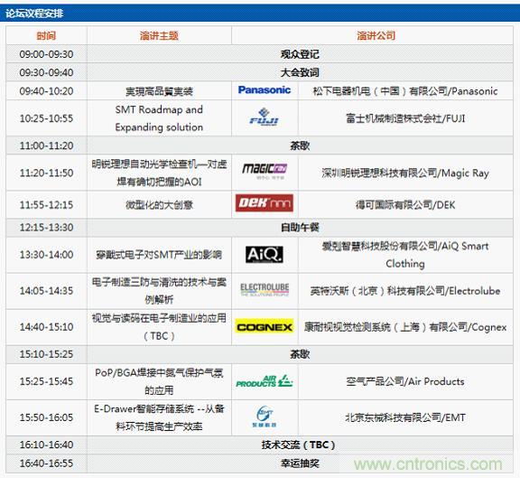 據主辦方介紹,為期一天的論壇將結合嘉賓演講和產品展示兩大形式為到場專業(yè)觀眾提供豐富的視聽體驗,更為電子制造設備/系統/方案使用者提供了深入了解供應商“智”造服務的良好機會。在嘉賓演講版塊,主辦方邀請到來自Panasonic(松下)、Fuji(富士機械)、明銳理想、DEK(得可)、英特沃斯、康耐視、空氣產品、東械等涵蓋電子制造全產業(yè)鏈各生產環(huán)節(jié)的領先供應商代表。在現場產品展示方面,與會觀眾更有機會近距離體驗來自Fuji(富士機械)、明銳理想、DEK(得可)、華普通用、英特沃斯、善思光電、章和電氣、首為國際(APOLLO SEIKO)、Praxair(普萊克斯)、東星科技、日本奧泰斯(OPTEX FA)等優(yōu)質供應商提供的先進技術及設備。