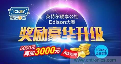 【導(dǎo)讀】英特爾Edison設(shè)計(jì)大賽是一個(gè)尋找國(guó)內(nèi)新生創(chuàng)客的舞臺(tái)。ICkey(云漢芯城)此次應(yīng)邀加盟英特爾Edison設(shè)計(jì)大賽,將為大賽全國(guó)30強(qiáng)選手每人提供價(jià)值5000元的電子元器件及開(kāi)發(fā)板等產(chǎn)品的資源贊助。