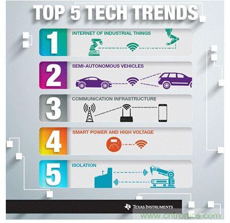 在迎接2015到來之際,我們有必要花時間來評估和預(yù)測未來的一年中將會出現(xiàn)的技術(shù)挑戰(zhàn)和突破創(chuàng)新。通過與眾多戰(zhàn)略客戶、大學(xué)合作伙伴以及TI產(chǎn)品線的技術(shù)專家進行探討后,我們認(rèn)為TI將在一些重要技術(shù)趨勢中發(fā)揮戰(zhàn)略性作用。這些技術(shù)趨勢正推動著汽車和工業(yè)等多個市場的發(fā)展,而在此過程中,TI的工程師將幫助應(yīng)對半導(dǎo)體技術(shù)領(lǐng)域的獨特挑戰(zhàn),并利用先進技術(shù)改善我們的生活。