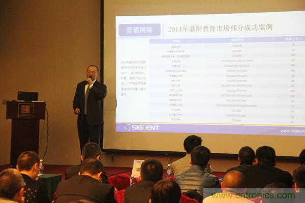 會(huì)議伊始,鼎陽(yáng)科技董事長(zhǎng)兼總裁秦軻先生進(jìn)行了精彩致辭,總結(jié)了鼎陽(yáng)科技在2014年取得的巨大成就,展望了鼎陽(yáng)科技在2015年的宏偉前景,為鼎陽(yáng)科技在新一年的持續(xù)高速增長(zhǎng)擺下了棋陣。2014年鼎陽(yáng)科技的銷售額增長(zhǎng)了41%;MSO2000、SDS3000、SDM3000在取得了眾多工藝上的突破之后順利量產(chǎn)。去年,鼎陽(yáng)科技美國(guó)分公司在克里夫蘭正式成立,為北美市場(chǎng)的下一輪增長(zhǎng)做了堅(jiān)實(shí)的鋪墊。2014年,鼎陽(yáng)科技參加了海內(nèi)外的多個(gè)大型展會(huì),標(biāo)志著鼎陽(yáng)科技正式立足于測(cè)試測(cè)量?jī)x器領(lǐng)域主流品牌的行列。與此同時(shí),鼎陽(yáng)科技與廣州工業(yè)大學(xué)深度合作,建立了聯(lián)合實(shí)驗(yàn)室,第一屆鼎陽(yáng)杯也圓滿落幕,增強(qiáng)了鼎陽(yáng)科技在高校用戶群體中的知名度,進(jìn)一步鞏固了鼎陽(yáng)科技在教育領(lǐng)域的影響力。
