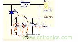 先看一個簡單的電路圖,圖1是通過采樣電阻R1和R2對流過LED燈的電流采樣,然后調整PWM輸出,以保證不同電壓下流過LED燈的電流恒定。