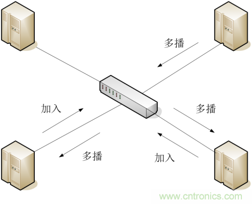 當(dāng)一臺(tái)裝置想加入某個(gè)多播組時(shí),首先發(fā)出GMRP加入報(bào)文,交換機(jī)將接到的GMRP加入報(bào)文的端口加入該多播組,并在VLAN中廣播該GMRP加入報(bào)文,VLAN中的多播源就知道了多播成員的存在。當(dāng)組播源向組播組發(fā)送組播報(bào)文時(shí),交換機(jī)只把該報(bào)文從先前加入到該組播組的端口轉(zhuǎn)發(fā)出去,從而實(shí)現(xiàn)VLAN內(nèi)的二次組播。如圖 1-2所示。