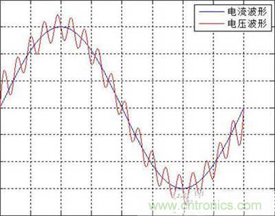 但是,當(dāng)對圖1所示的相位差為0的純正弦交流電中的電壓注入2~18次諧波后,波形如圖2所示。這里僅是對電壓的波形注入了多次諧波,并未改變電壓基波與電流之間的相位角,根據(jù)功率因數(shù)的定義,其測量結(jié)果所得功率因?yàn)閼?yīng)當(dāng)?shù)扔?,但實(shí)際上,對圖2波形進(jìn)行功率因數(shù)測量時其結(jié)果為0.9543,與真實(shí)測量結(jié)果相比是偏小的,在現(xiàn)實(shí)測量過程中,諧波的頻譜含量可能更為豐富,此時測量結(jié)果可能遠(yuǎn)遠(yuǎn)偏離真實(shí)值。