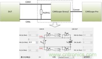 1. 如圖1所示,進(jìn)行測試連接。測試使用CANScope-Pro的眼圖功能,進(jìn)行統(tǒng)計以達(dá)到高的測試精度。DUT上電后,要一直發(fā)送CAN報文, CANScope不勾選總線應(yīng)答,其黑色表筆(地)要和DUT的CAN收發(fā)器共地。