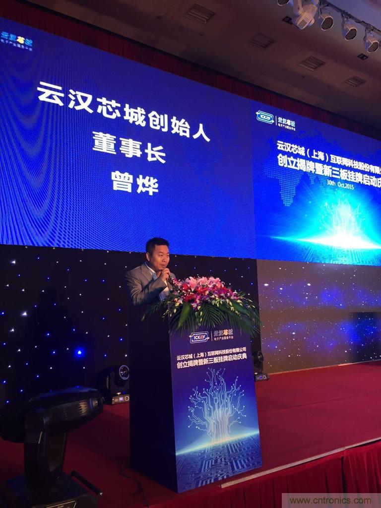 啟動(dòng)儀式上,云漢芯城創(chuàng)始人、董事長(zhǎng)曾燁介紹了公司在傳統(tǒng)電子產(chǎn)業(yè)耕耘多年后毅然轉(zhuǎn)戰(zhàn)互聯(lián)網(wǎng)的蛻變歷程,并宣布云漢芯城已順利完成股改,成功啟動(dòng)新三板掛牌。上海云漢電子有限公司正式更名為云漢芯城(上海)互聯(lián)網(wǎng)科技股份有限公司(以下簡(jiǎn)稱“云漢芯城”)。
