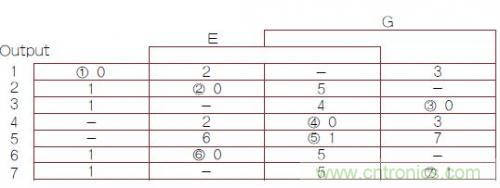 圖2:異步有限狀態(tài)機(FSM)轉換主表,其中1,2,3,4,5,6,7帶圈的數字是穩(wěn)定FSM狀態(tài)號(G是時鐘輸入)。