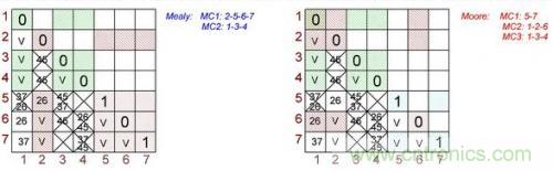 圖3:根據Mealy(左)和Moore(右)狀態(tài)機做出的最終表格對。