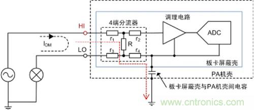 3.電流通道接入高端和低端,測量結果也不同,內部板卡屏蔽殼與機殼間多少都會存在一些雜散電容(空間中兩個絕緣導體中存在電容),若電流通道接入高端,產(chǎn)生泄漏電流(圖3中紅色標記線),因此電流測量輸入應當串在共模電壓較低的地方(低端)。