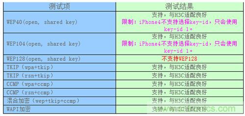 從測(cè)試結(jié)果可以看出:除了WEP128,iPhone 4對(duì)各種加密方式均能很好的支持,在采用混合加密的H3C WLAN網(wǎng)絡(luò)中也能很好的相互適配。