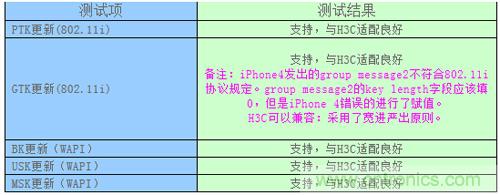 從測(cè)試結(jié)果可以看出,iPhone 4的GTK更新報(bào)文并不符合802.11i協(xié)議的規(guī)定,對(duì)group message2的key length域錯(cuò)誤的進(jìn)行了賦值。H3C設(shè)備由于對(duì)此采用了寬進(jìn)嚴(yán)出的原則,可以很好的進(jìn)行兼容。這一點(diǎn)也體現(xiàn)出手機(jī)終端兼容性測(cè)試的重要性。