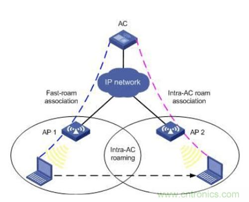 AC內(nèi)漫游(Intra-AC roaming):一個(gè)無(wú)線終端從AC的一個(gè)AP漫游到同一個(gè)AC內(nèi)的另一個(gè)AP中,即稱為AC內(nèi)漫游。如圖1所示。