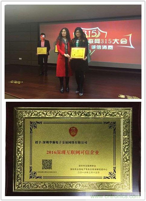 【導讀】“3.15”是國際消費者權益日,當天下午,2016深圳互聯(lián)網315大會在中國(深圳)新媒體廣告產業(yè)園舉辦。大會現(xiàn)場頒發(fā)了深圳“可信企業(yè)”驗證3項大獎,深圳華強電子交易網絡有限公司獲獎,成為5家“2016深圳互聯(lián)網可信企業(yè)”之一。