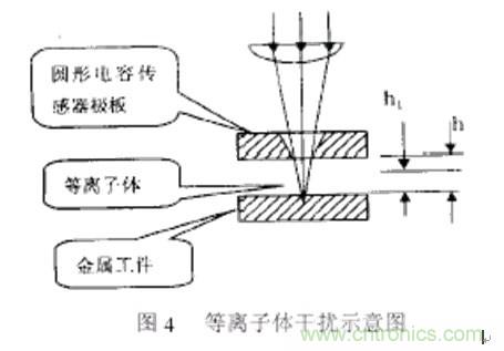 在工件尚未被切穿的瞬間,激光和金屬相互作用,在噴嘴和加工對象之間產(chǎn)生云霧狀等離子體,改變電容極板之間的介質(zhì),從而對電容傳感器產(chǎn)生干擾。在正常切割過 程中,輔助氣體將等離子體從切縫中吹散,對電容傳感器產(chǎn)生影響較小。但假如加工速度太快和剛開始切割時,由于工件未被完全切穿,激光照射點四周會產(chǎn)生等離 子體云,對電容傳感器產(chǎn)生干擾,嚴重時甚至使傳感器無法正常工作,嚴重影響加工質(zhì)量。圖4為等離子體干擾示意圖。